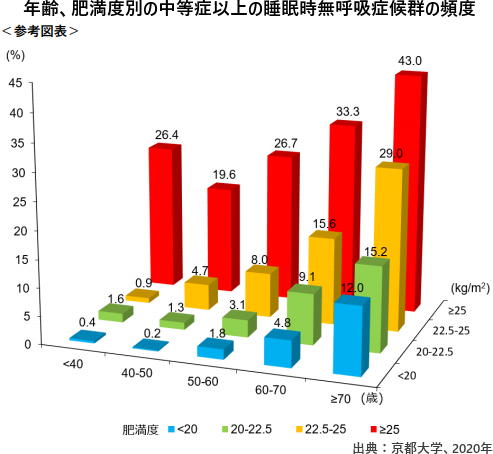 また、年齢とともに有病率が増えることに加えて、若い世代にとっては肥満が大きな原因となっている一方で、年齢とともに肥満が高度でなくても別の要因でSASになることも推測されます。